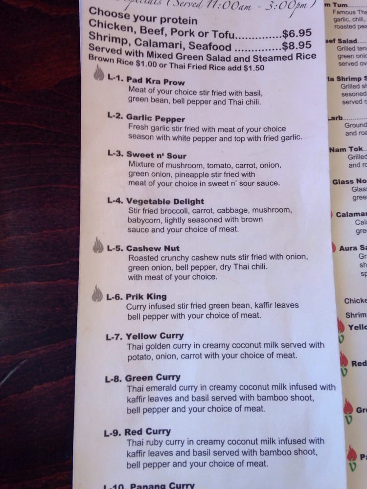Meat of your choice stir fried with basil, green bean, bell pepper and Thai chili. Served with mixed green salad and choice of rice.